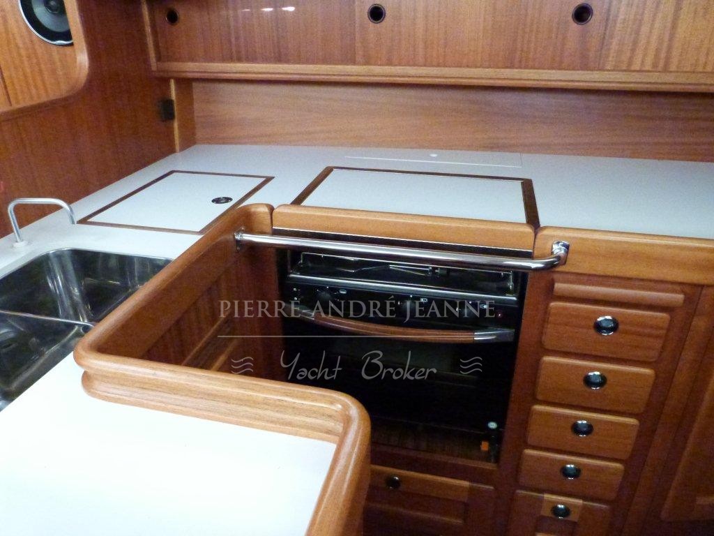 The galley has a two-burner propane stove/oven with a stainless-steel protective rail. Twelve-volt refrigeration is standard; a freezer is optional. Opposite the galley, the chart table has adequate space for electronic installations. Aft of the chart table is a large head, the only one aboard, which has a stall shower with a teak grating. All shower water is pumped directly overboard and never into the bilge. The stainless-steel holding tank has a gravity drain.